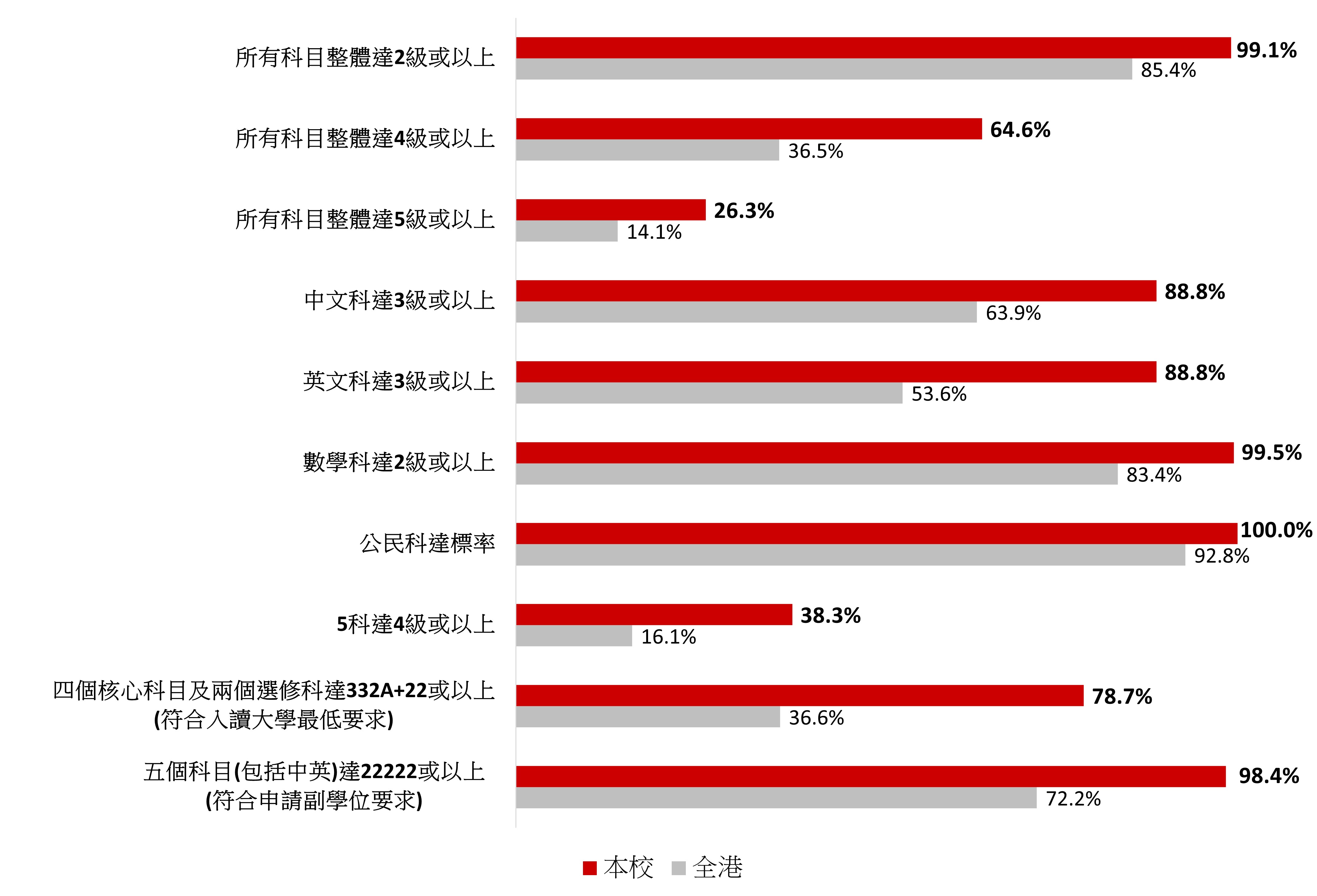 本校為一所優質直資中學,校風純樸,學生公開考試成績優秀。今年本校有188名學生參加第十四屆香港中學文憑試,成績表現優異,所有科目整體的合格率(2級或以上)達99.1%,優良率(4級或以上)達64.6%,遠高於全港水平,而符合入讀高等院校基本要求(核心科目中、英、數、公民科及2科選修科符合332A+22或以上者)亦達78.7%,遠高於全港36.6 %。詳情如下:徐禮綱獲2科5**、3科5*,陳泓愷獲2科5**、1科5*,陳栩越獲2科5**,馮子晴、梁皓僖、李君培及楊頌生均獲1科5**、1科5*,成績優異!